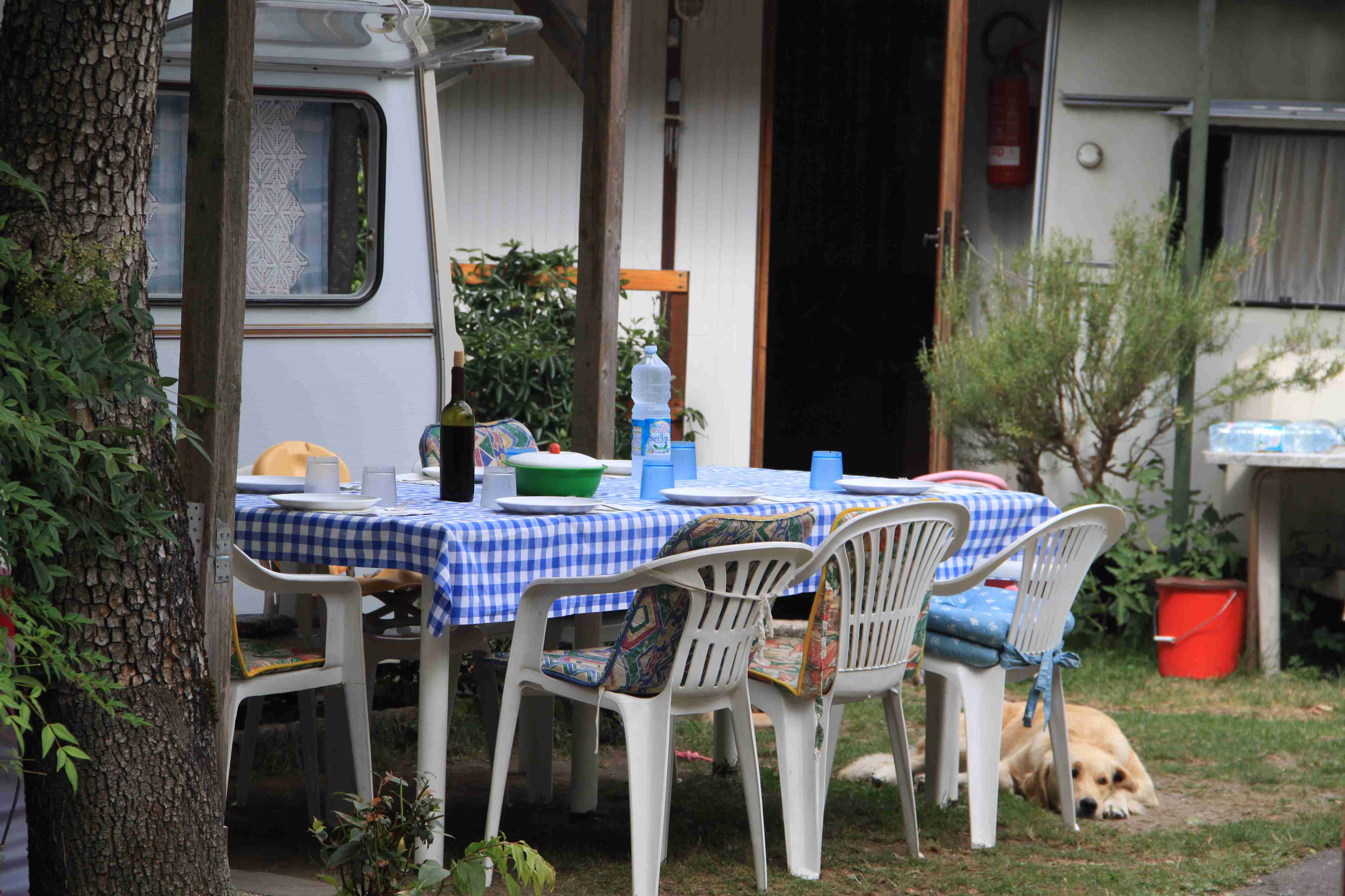 Auf dem ganzen Platz herrscht fröhliche, sonnige Stimmung. Vor den Wohnwagen sitzen die Familien geschlossen an großen Tischen, geniessen in der Mittagshitze im Schatten