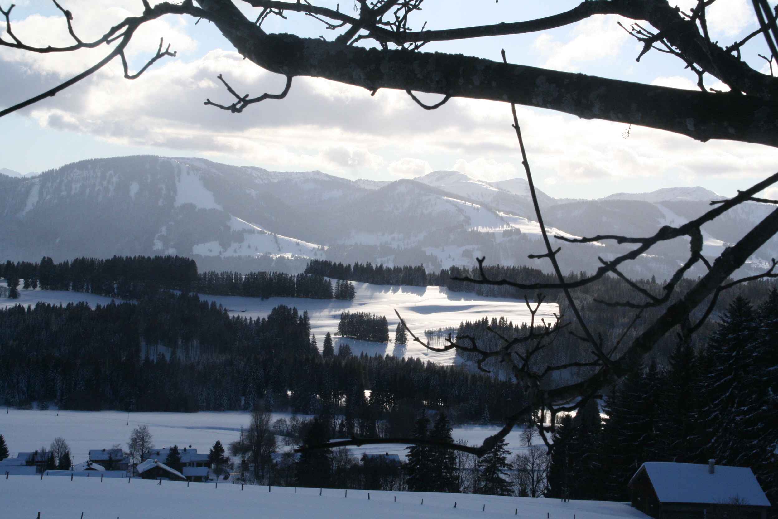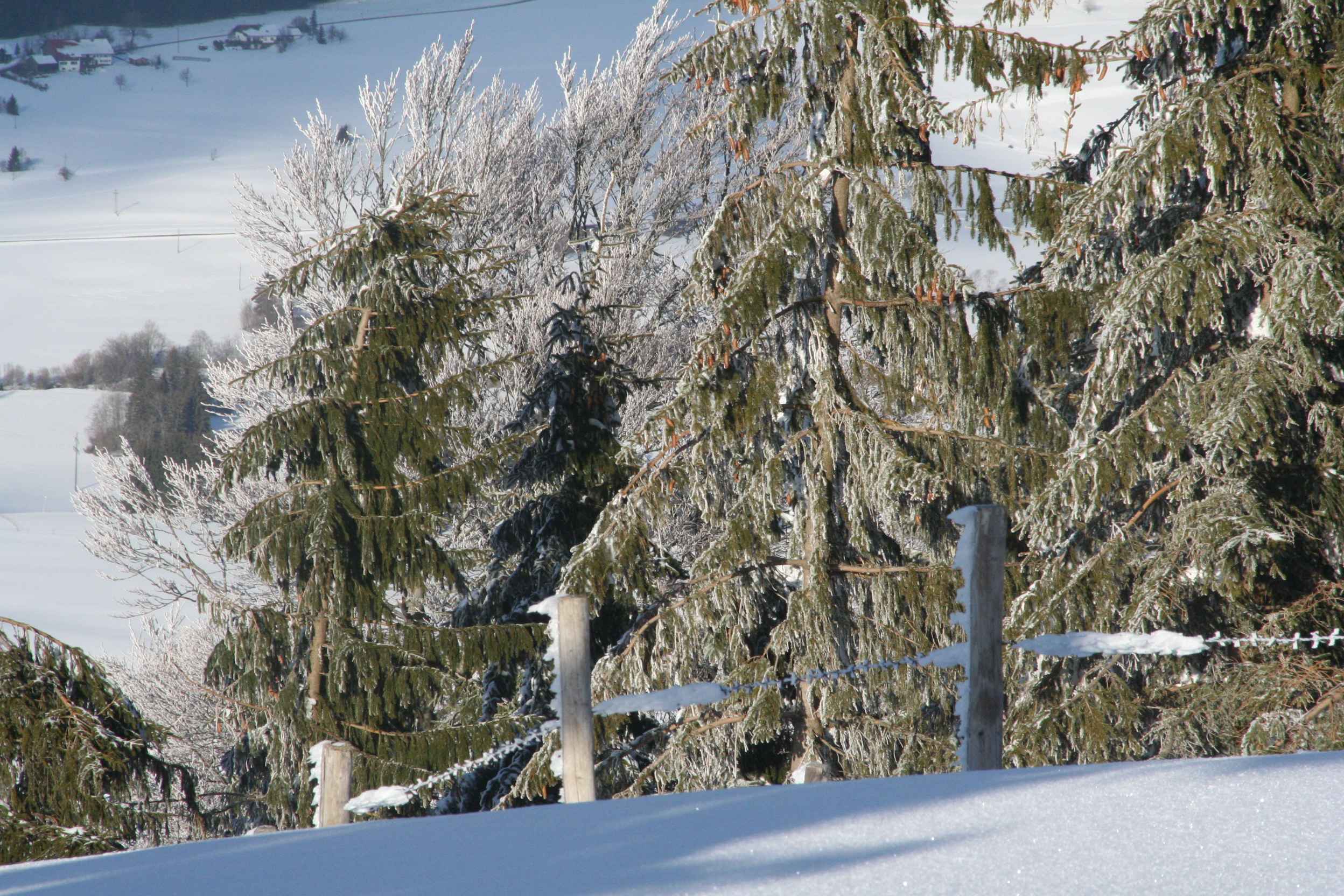 normalen Weg abbiegen. Der Weg führt eine Weile durch herrlich verschneiten Wald, dann, bei einer Hütte rechts hoch in den Wald. Eine Wiese überqueren