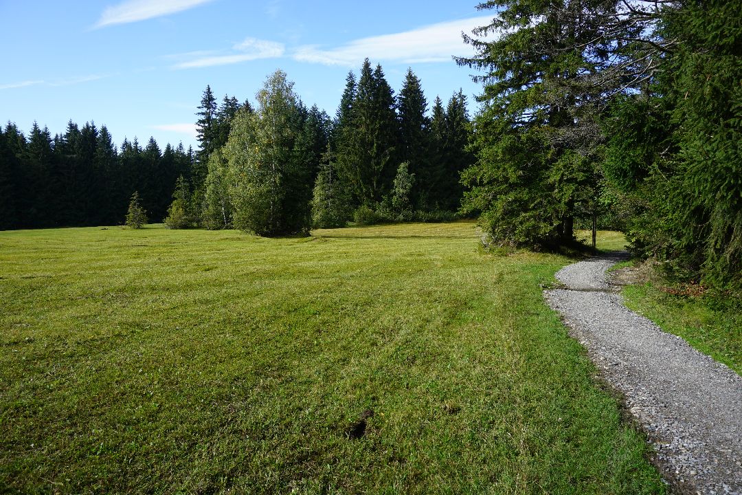 Hier, ein Stück unterhalb links im Wald vor zum Wildrosenmoos und von dort