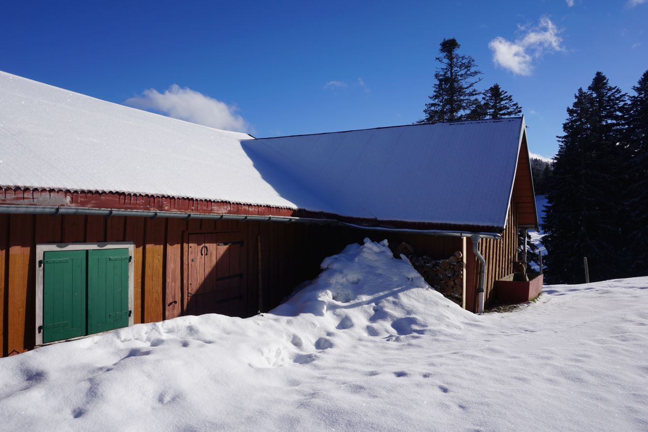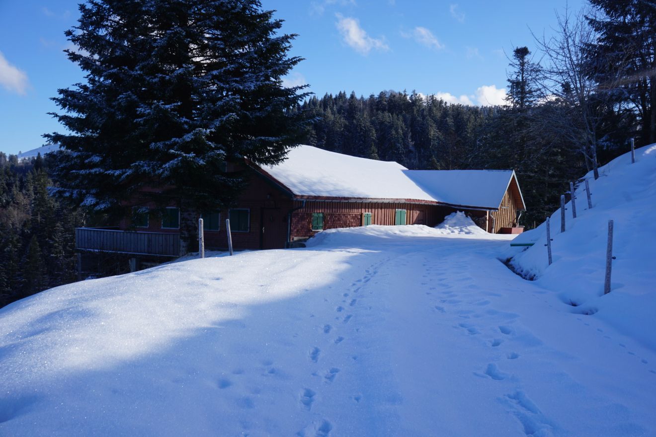 Wir kommen an der Schwandeneckalpe vorbei, die noch richtig eingescheit aus-