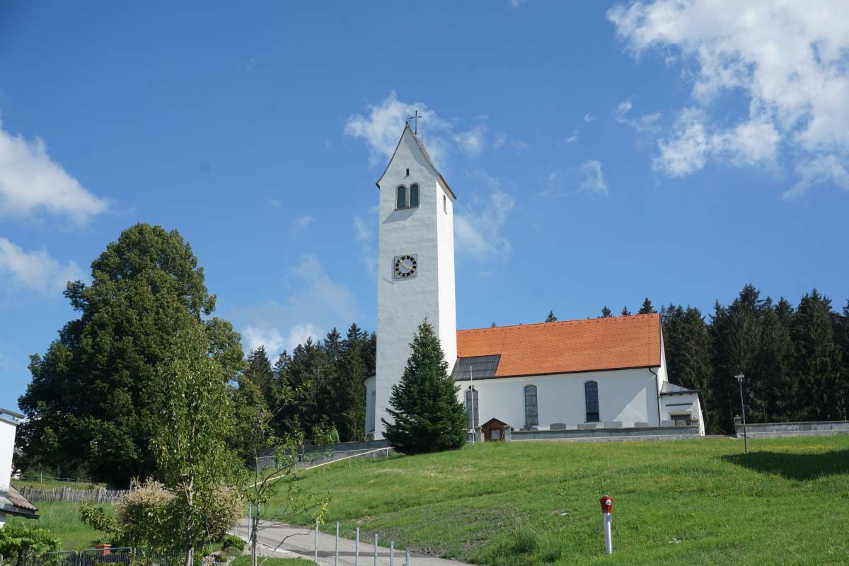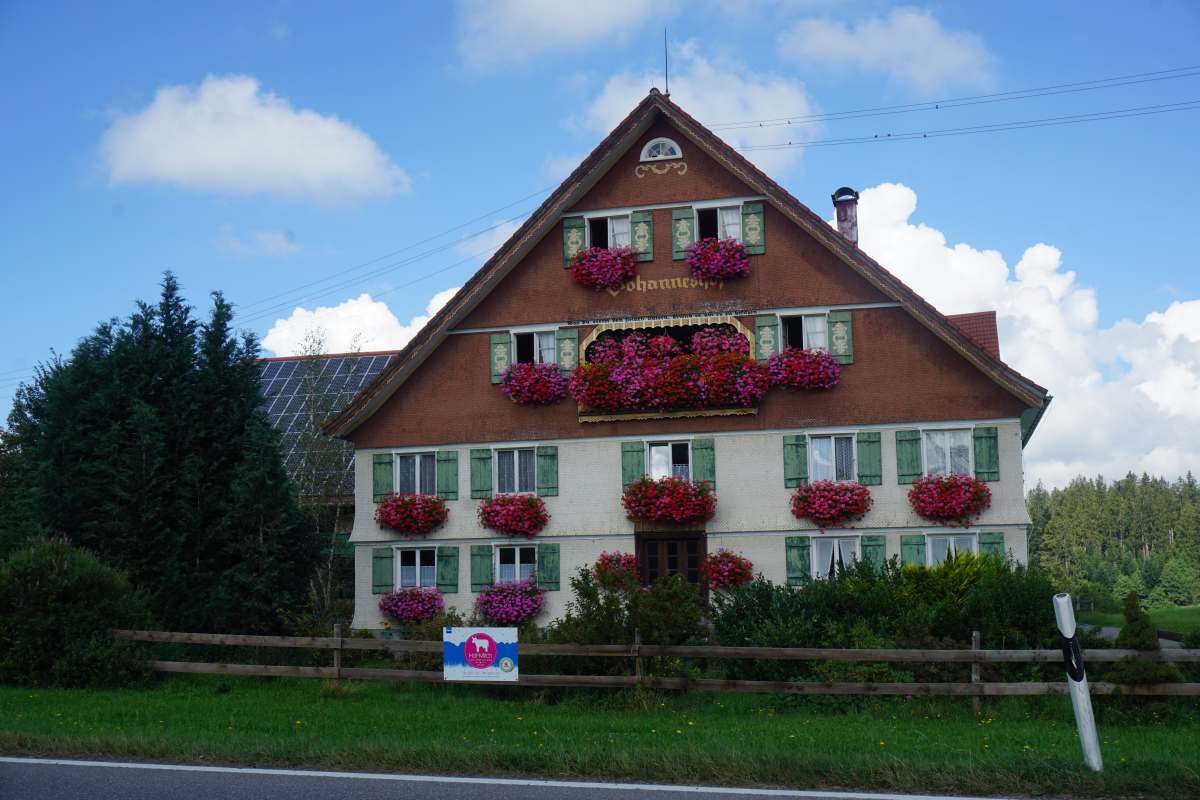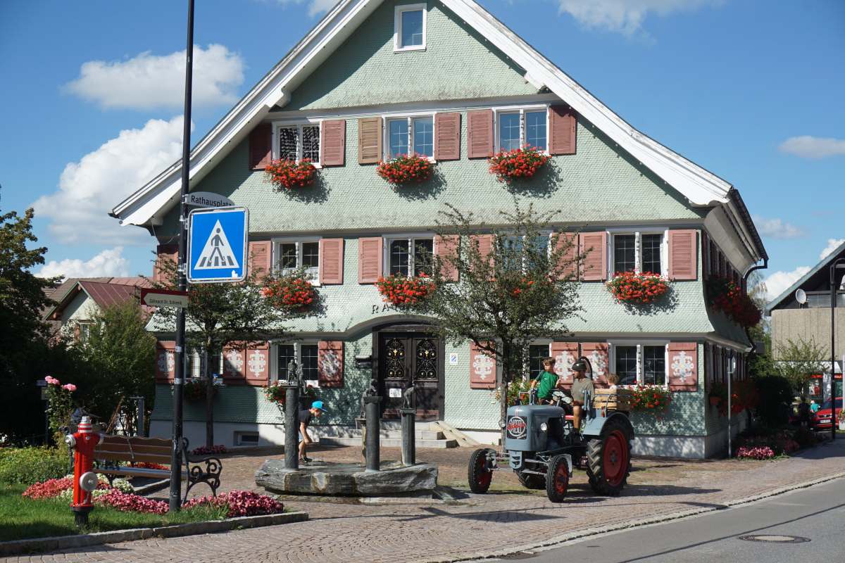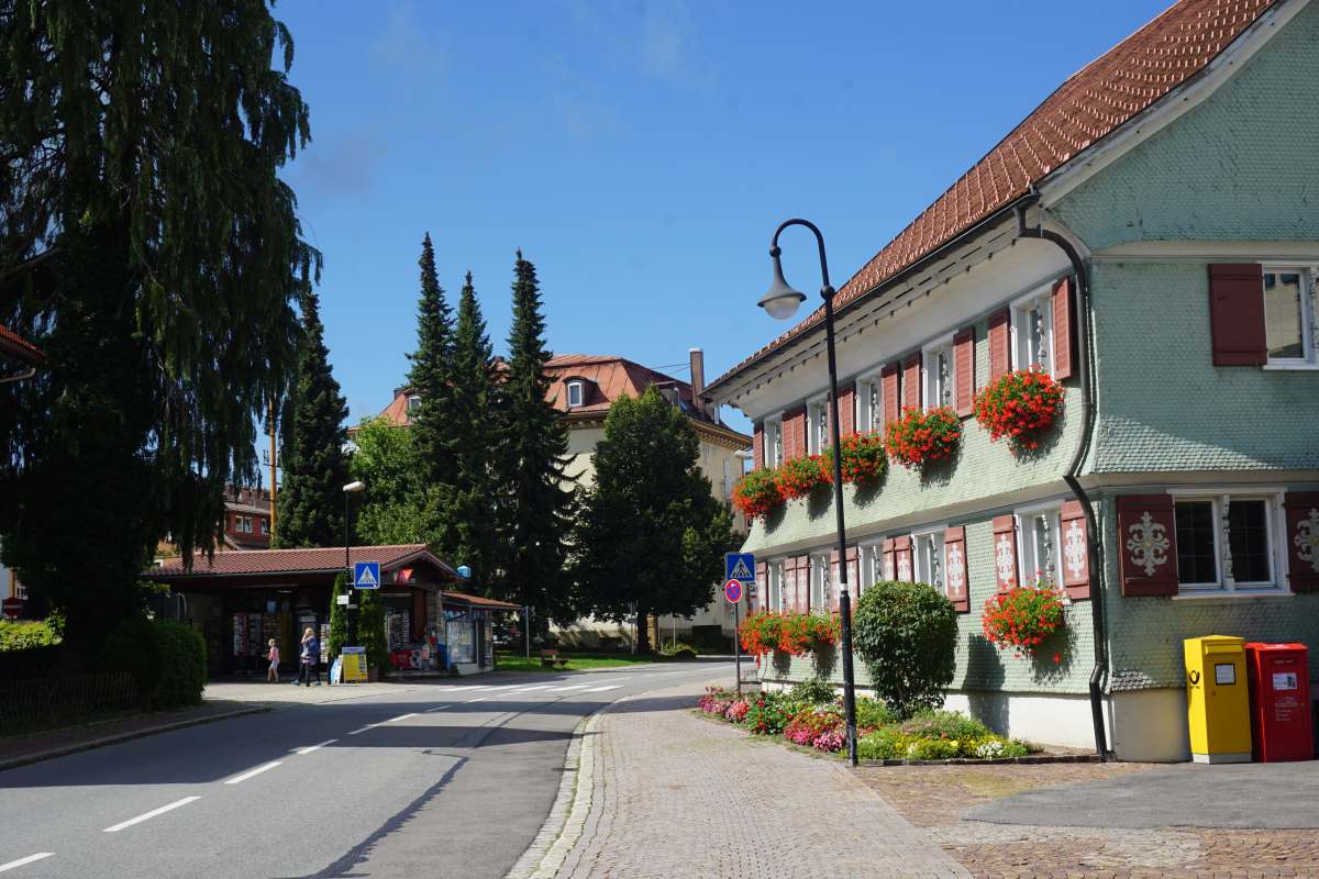 strasse. Dann an der Hauptstrasse, vorbei an schmucken westallgäuer Häusern und Gastwirtschaften