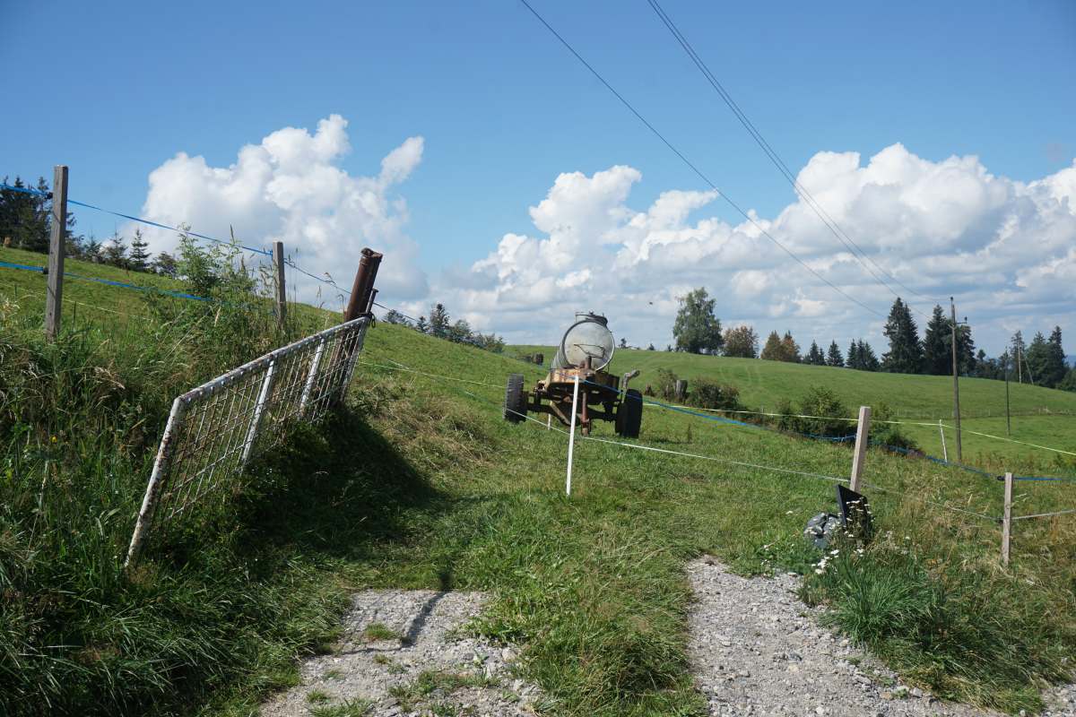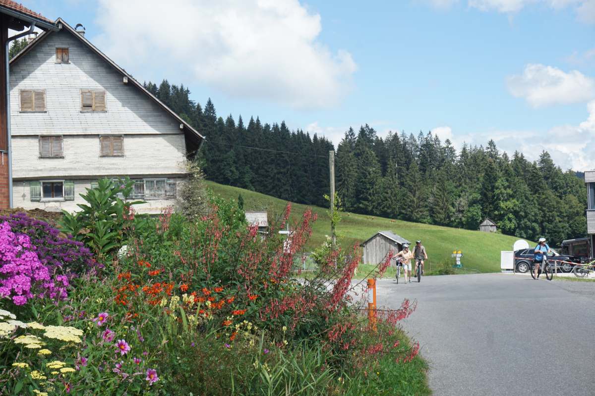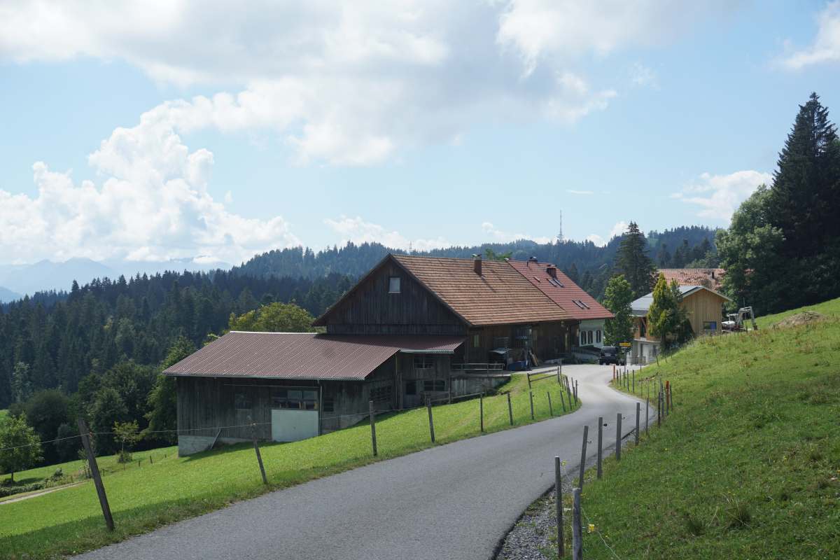 Nach Schüssellehen geht es kurz hinab (Teerstrasse jetzt) und bei der nächsten Abbiegung links hinauf