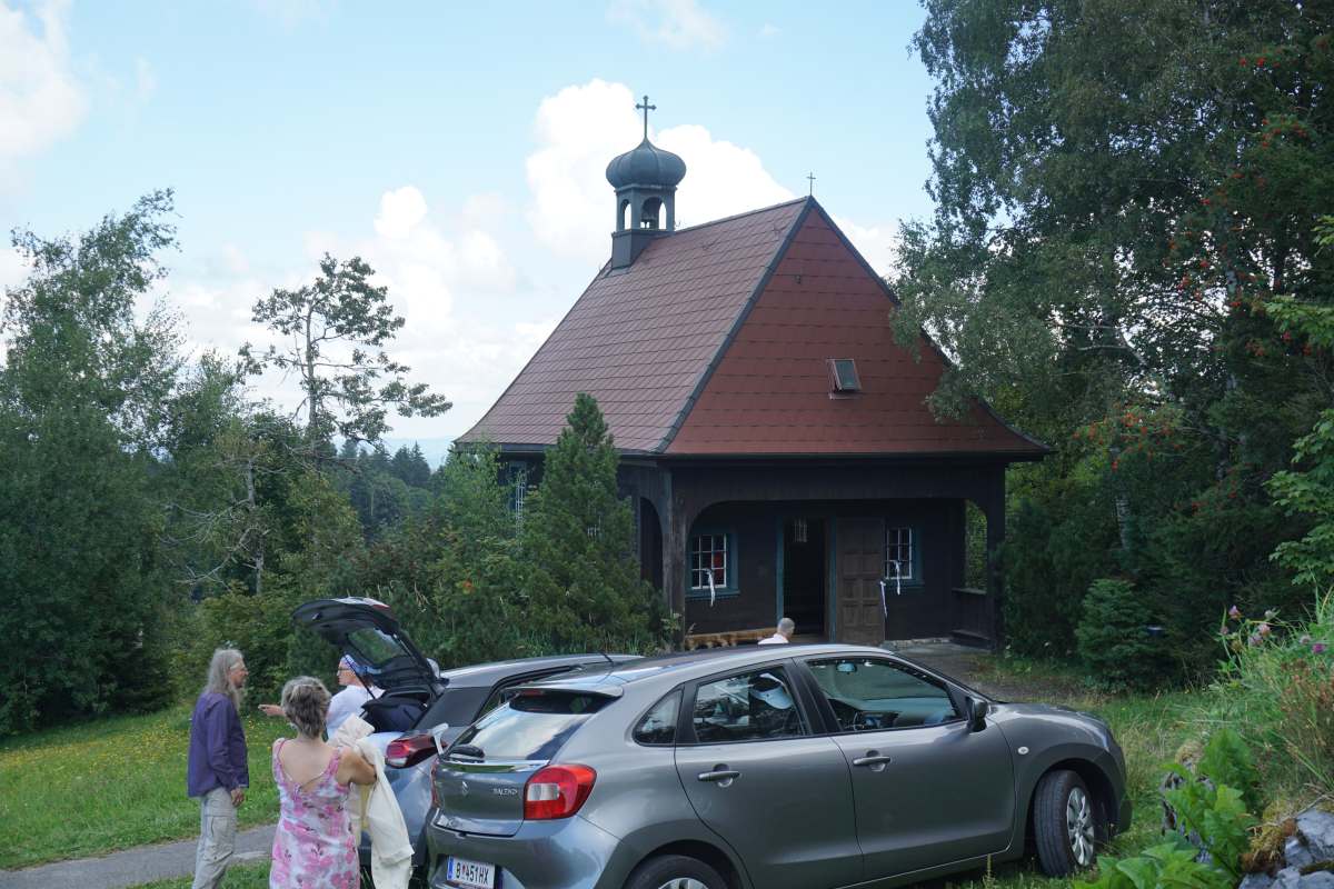 die Räder stehen und wandern gemütich hinauf, vorbei an der Kapelle zum Gasthaus Schwedenschanze, einem