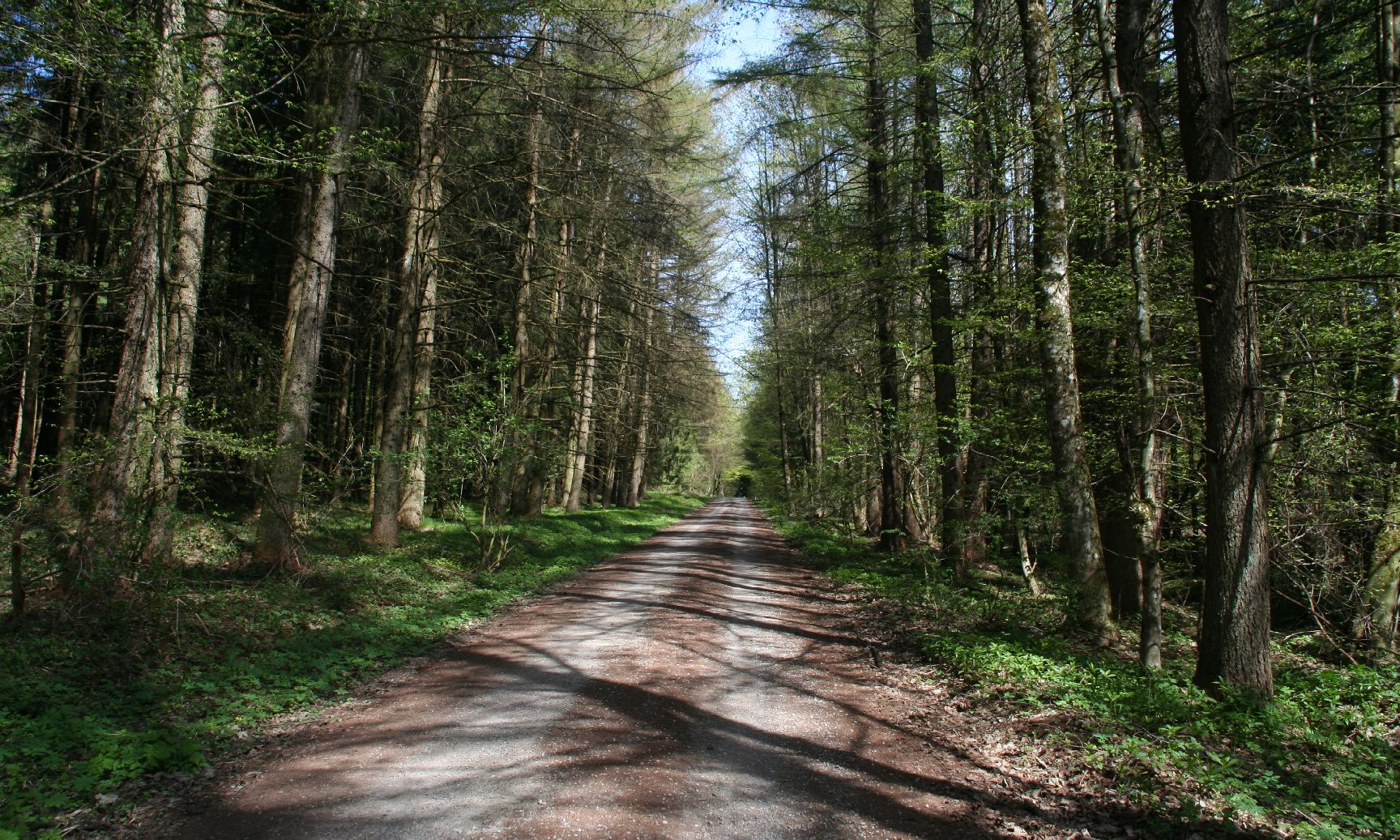 immer auf dem Forstweg geradeaus ohne abzubiegen bleibend durch den schönen Schweinwald mit leichter Steigung. Am Ende des Waldes ist schliesst sich