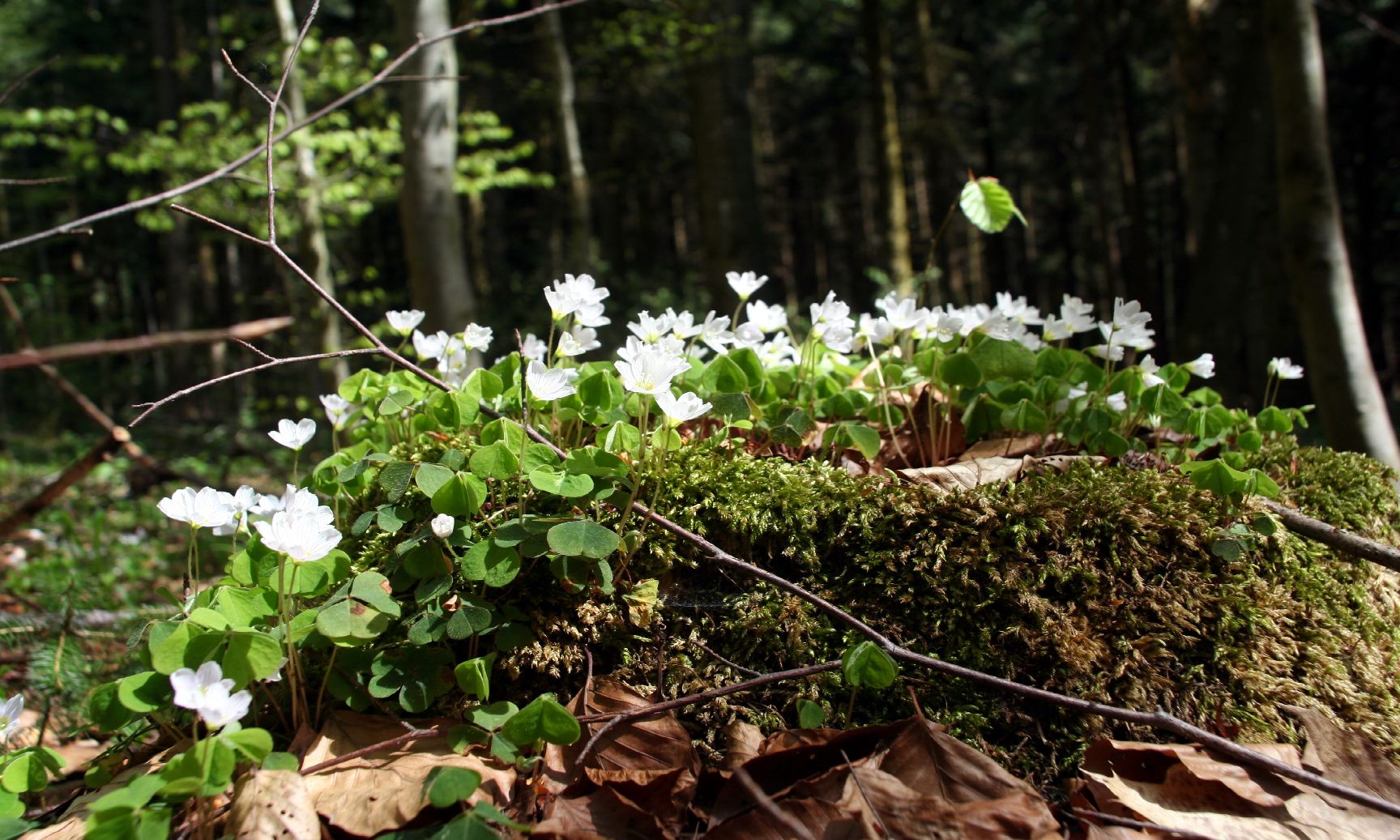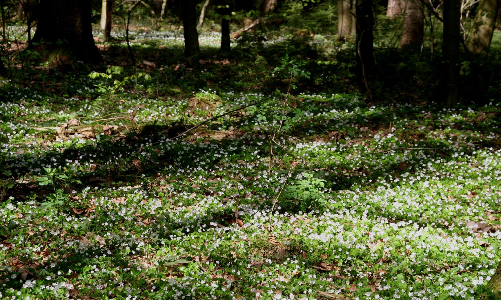 Überall blühen ganze Teppiche von weissen Blumen (Anemonen?) auf dem Waldboden. Bei der nächsten Abzweigung links halten und dann immer geradeaus bis