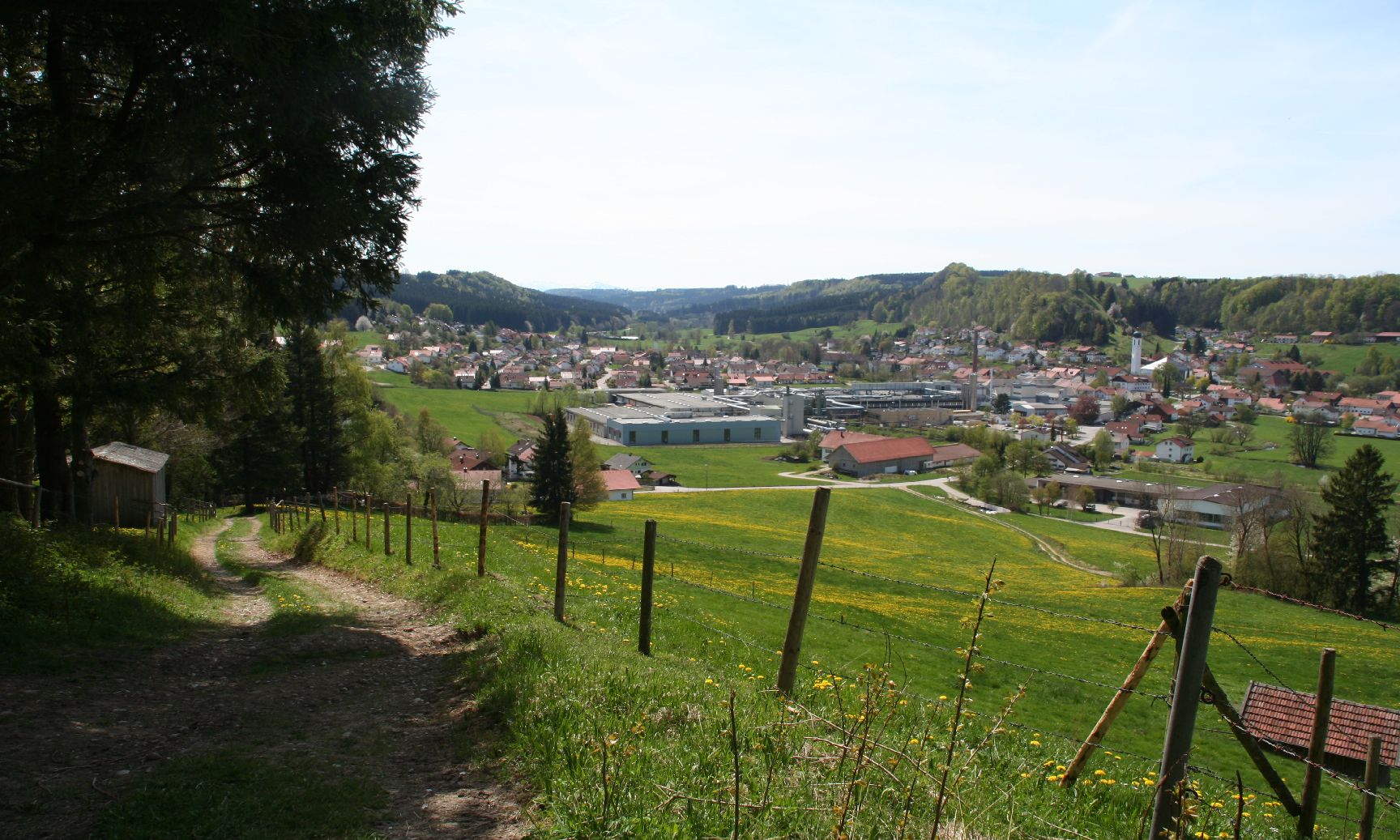 in schönen Kurven flott hinab nach Ronsberg. Beim Sport-Schindele links, kurz danach rechts durchs Dorf einen mit neuen Häusern besiedelten Hang