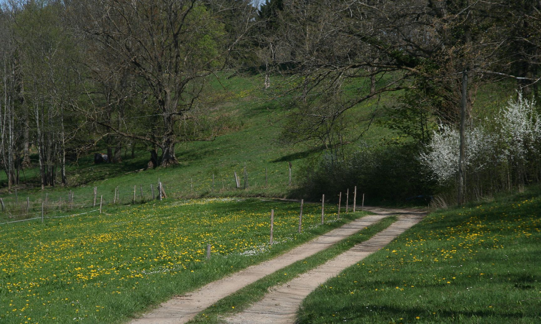 hinauf und immer schön links halten. Beim letzten Haus oben am Hang endet dann die Teerstrasse und ein schmaler, recht steiler Feldweg führt am Waldrand