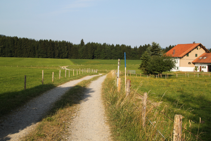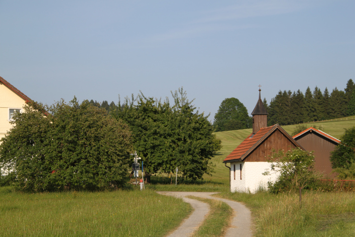 Hier rechts auf der schmalen Strasse in Richtung Isny, bis diese bei Ziegelstadel in die