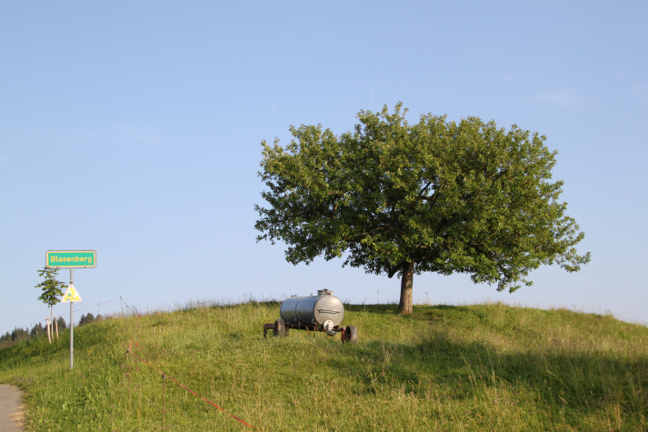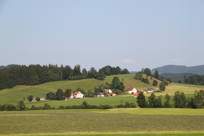 Landschaft nach Schliesslang. Dort rechts hinüber bergauf nach Blasenberg und Hengeles.