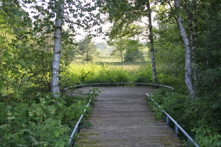 Von hier geht es links auf Stegen in den Wald, bis der Pfad in einem Strässchen endet. Dem folgen