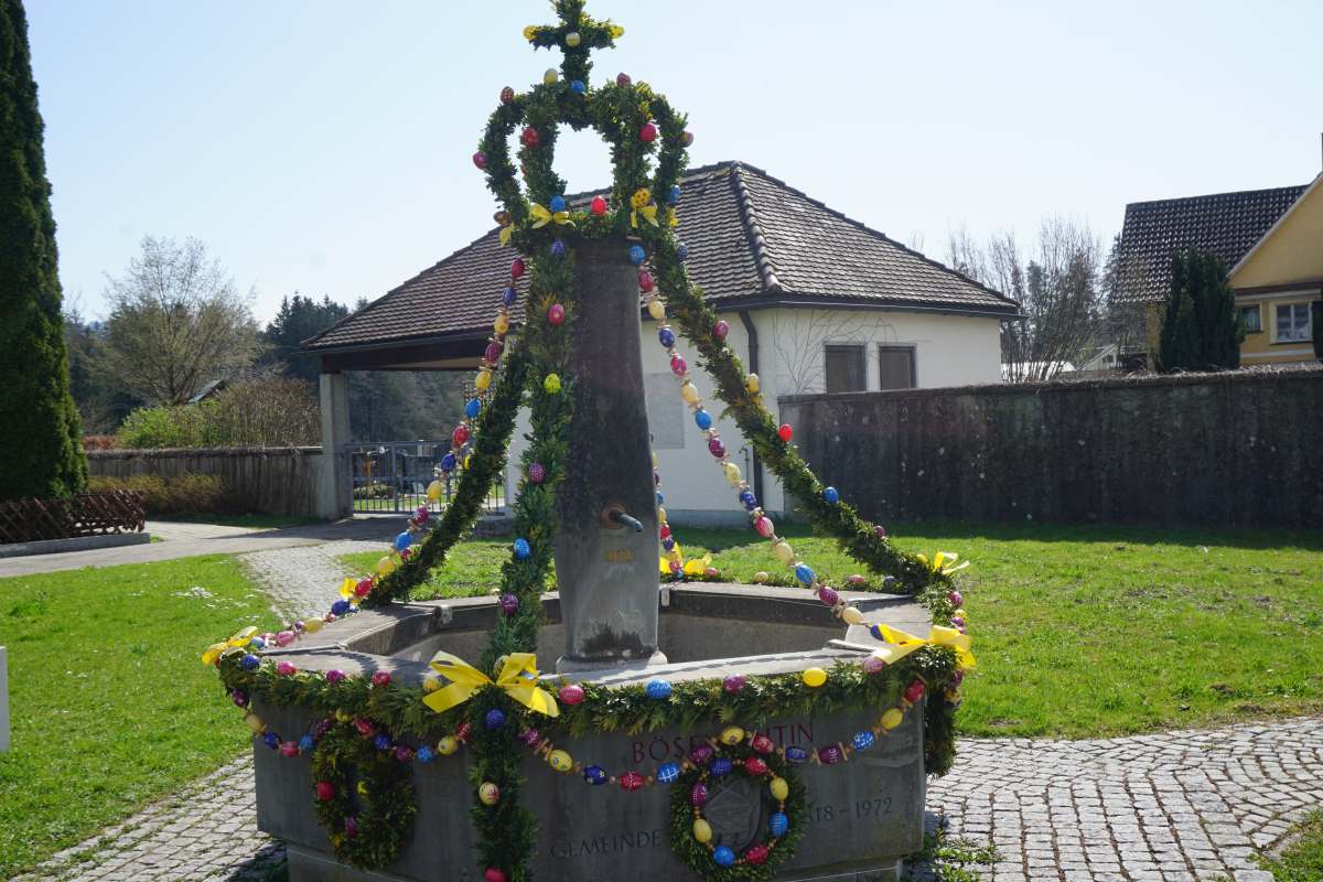 Hang hinab nach Bösenreutin. In der Ortsmitte bewundern wir den schön geschmückten Osterbrunnen
