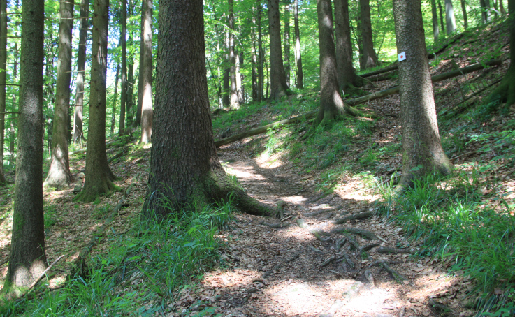 Es geht schön im Wald bergauf. Das Gelände ist von vielen Gräben durch-