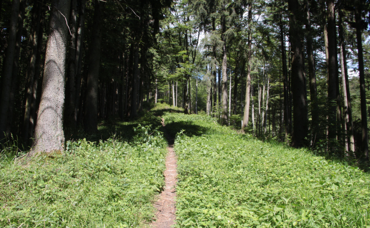 linken Seite. Dort beginnt rechts ein Weg, der in den Wald hineinführt