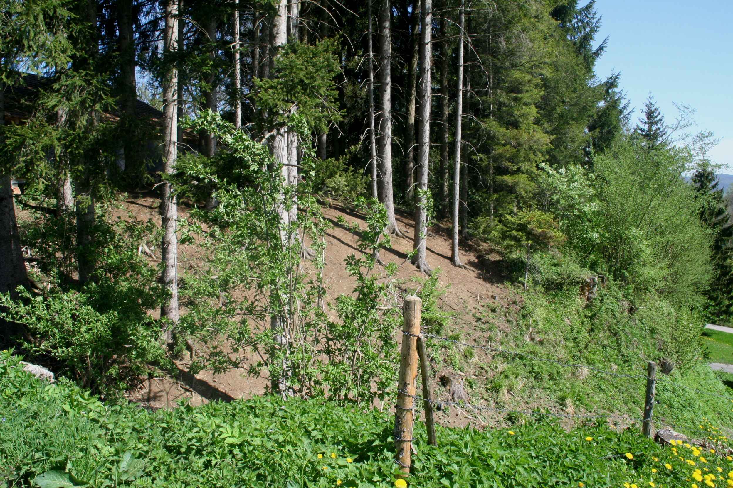 Es sind nur noch eingeebnete Reste eines früher mal ca. 30x30 m durchmessenden runden Burghügels vorhanden. Auf dem Hügel befindet sich ein Stadel und eine Jauchegrube. Hinten, am Hügel-Abhang