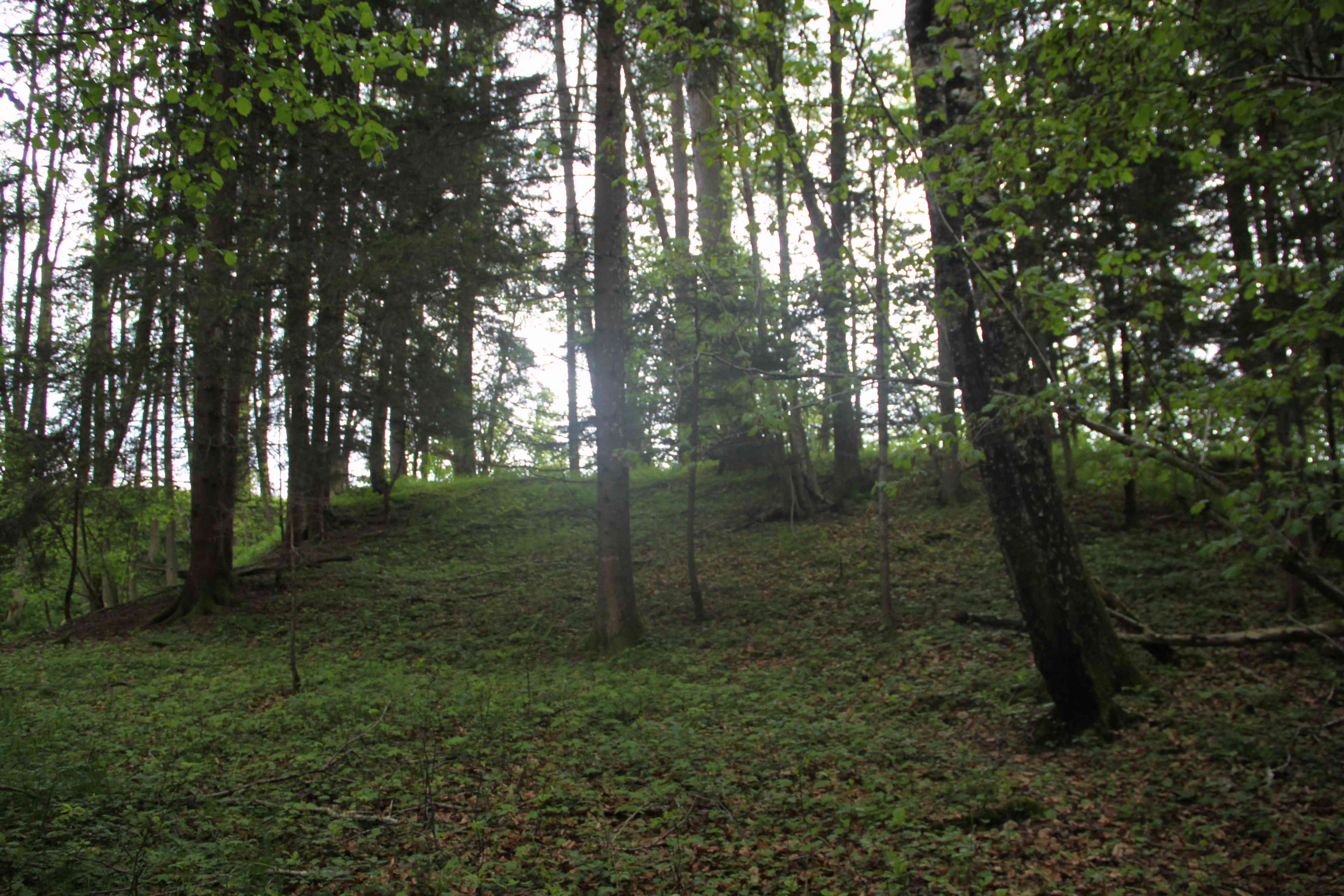 Hinten ist die Burgstelle durch ein Tobel abgegrenzt. Ausser dem Gedenkstein ist nichts mehr zu sehen.